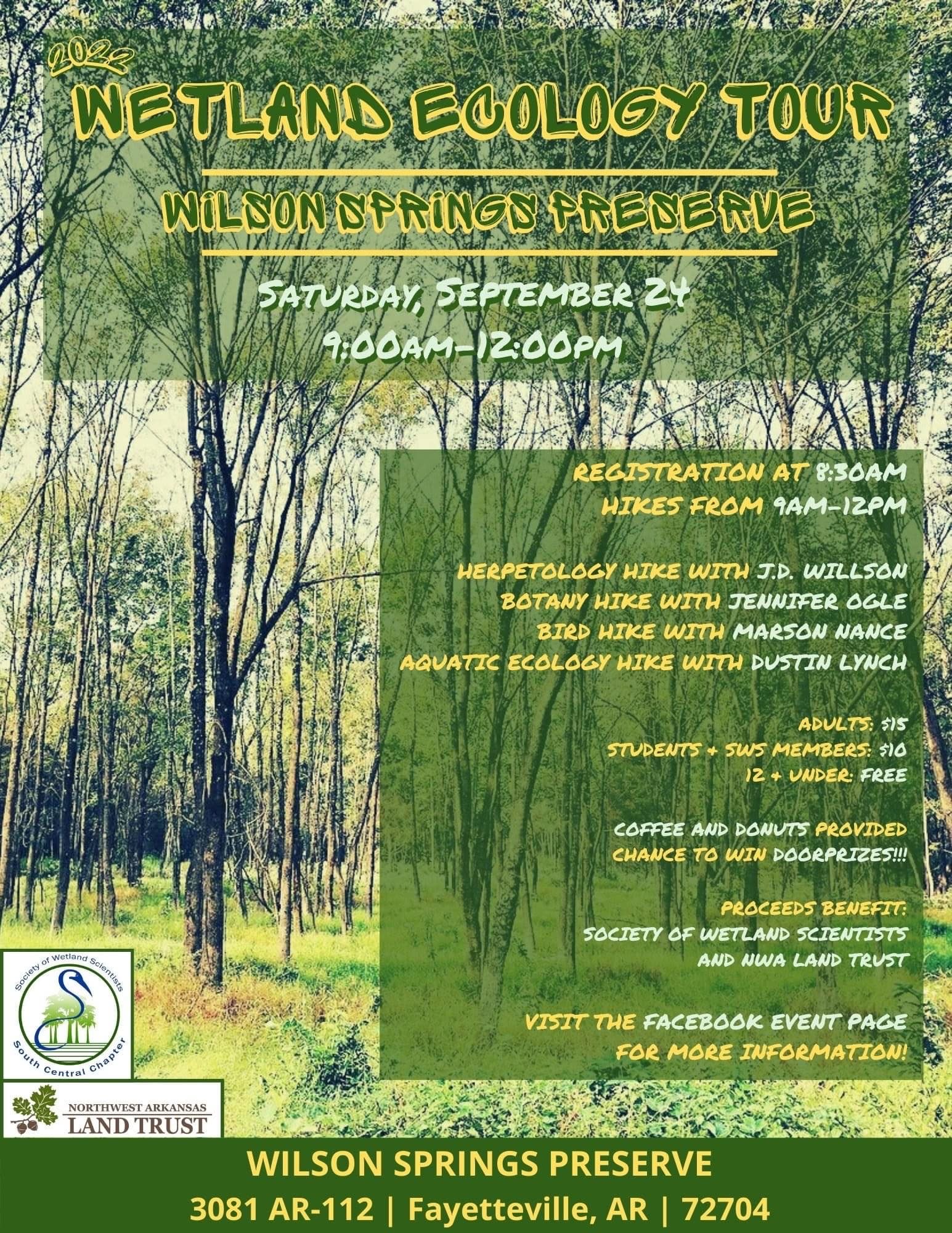 Participants should plan to arrive at 8:30 a.m. on September 24, with hikes running from 9:00 a.m. to 12:00 p.m. Parking will be by the Wilson Springs Nature Preserve Trailhead on the south side of the Sam’s Club parking lot at 3081 AR-112, Fayetteville, AR, 72704. Coffee and doughnuts will be provided, and door prizes will be given away. All proceeds benefit the Society of Wetland Scientists and the NWA Land Trust.